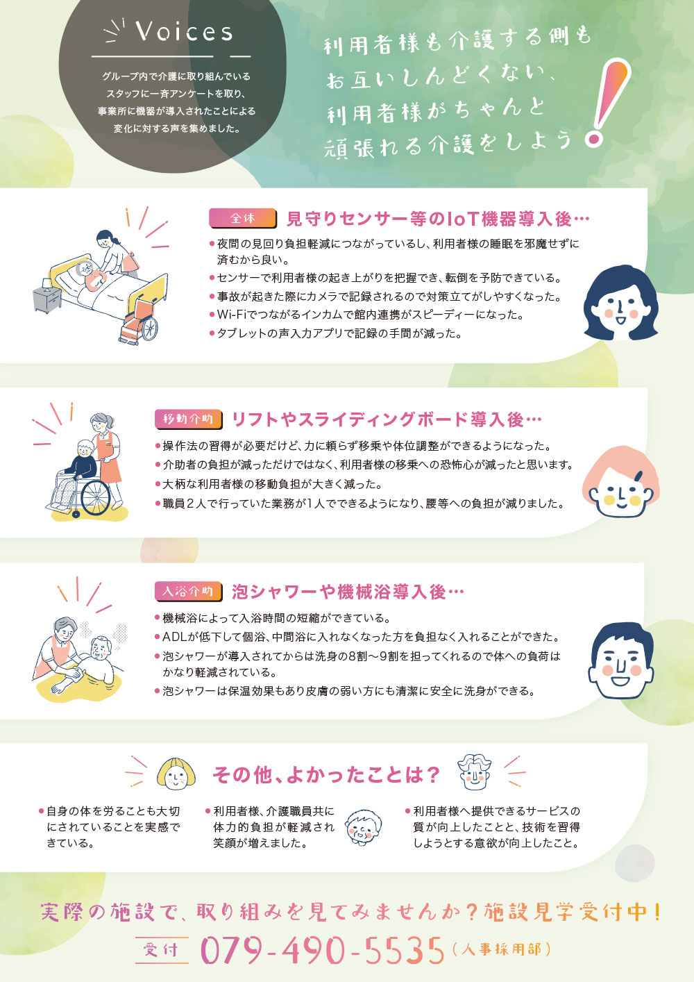 先進技術導入による介護とそのスタッフアンケートを、楽しく分かりやすくデザインしました。
