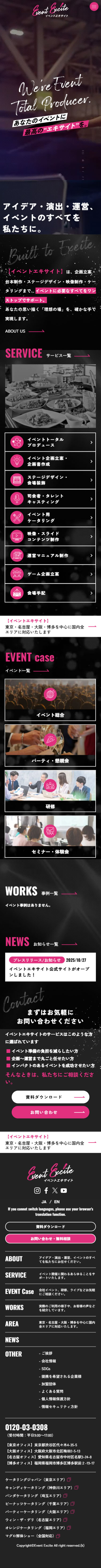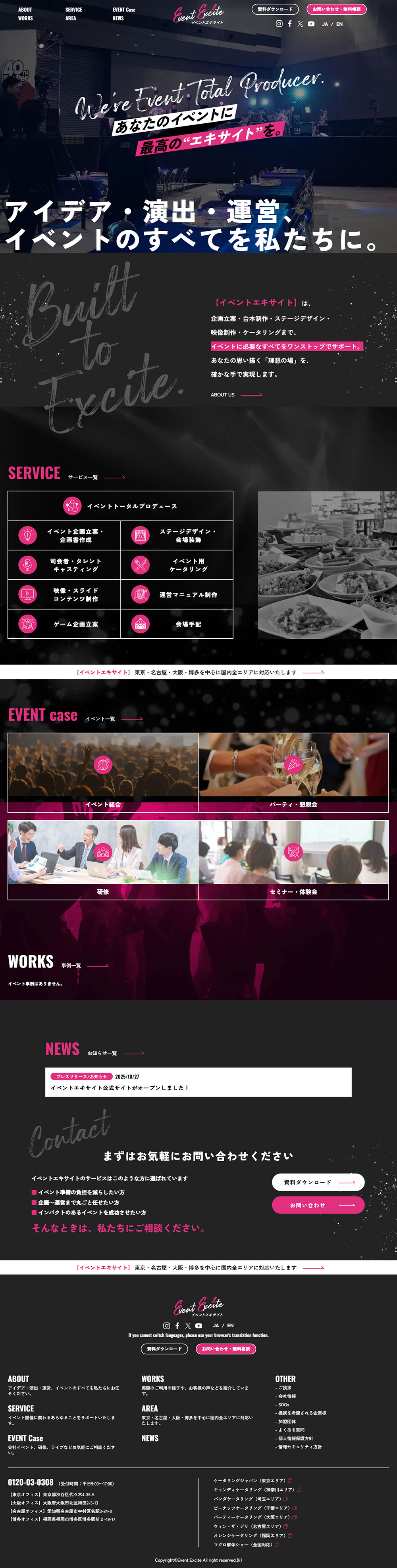 企業イベントに特化したプロデュースサービスのサイトです。「男性的なかっこよさ」のイメージで、モノクロをベースとしつつもビビッドな挿し色を入れ、インパクトあるデザインにいたしました。